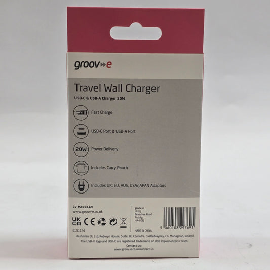 New Groov-e 20W USB-C/USB-A Travel Wall Charger GV-MA113-WE